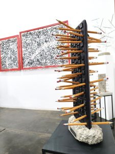 In this exhibition, Matthieu Kowad presents a collection of sculptures and sculptural paintings in which the pencil takes center stage. A simple yet essential everyday object, the pencil is the starting point of all creation: with it, ideas become visible and thoughts take shape.