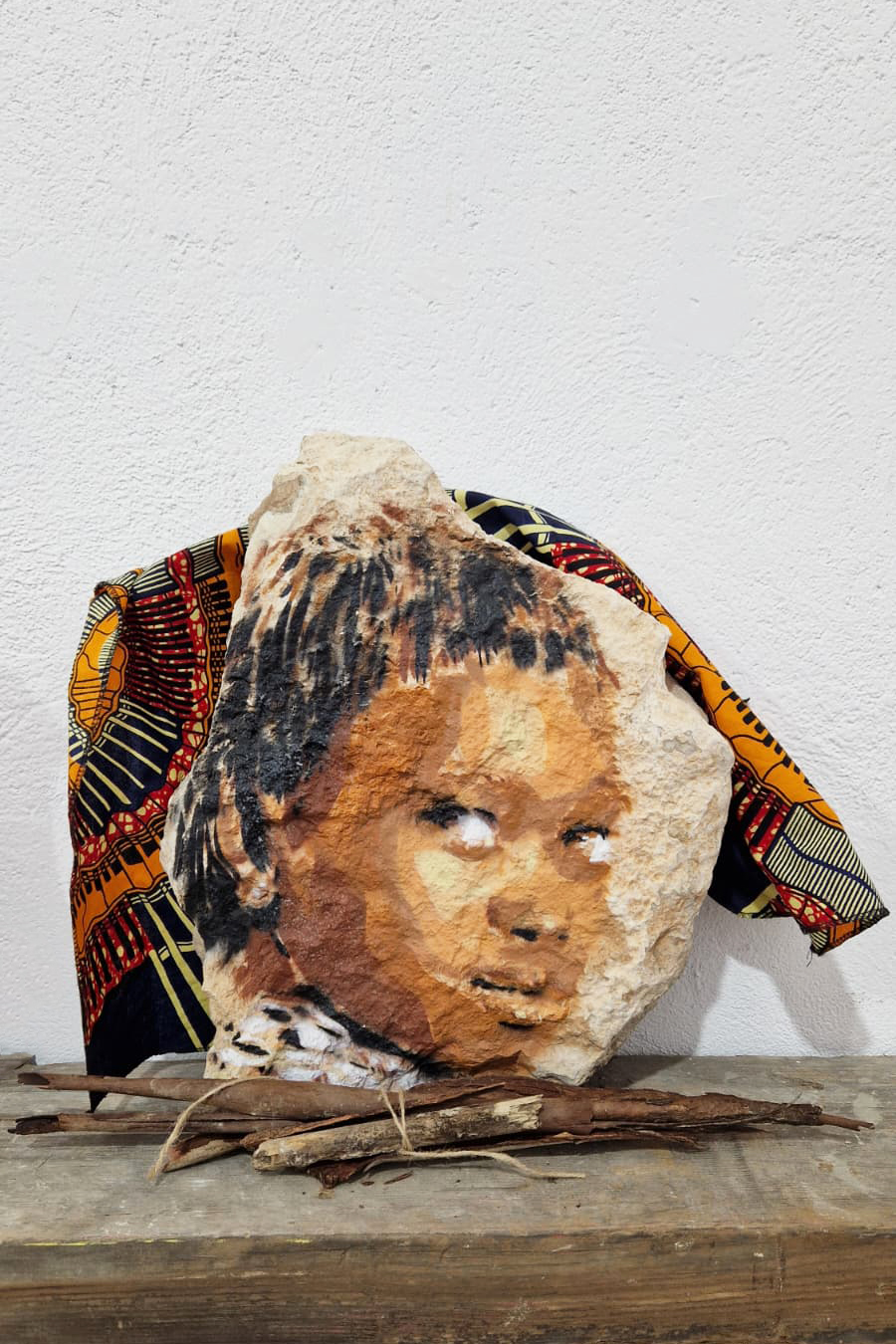 Spray paint on stone, wood and fabric