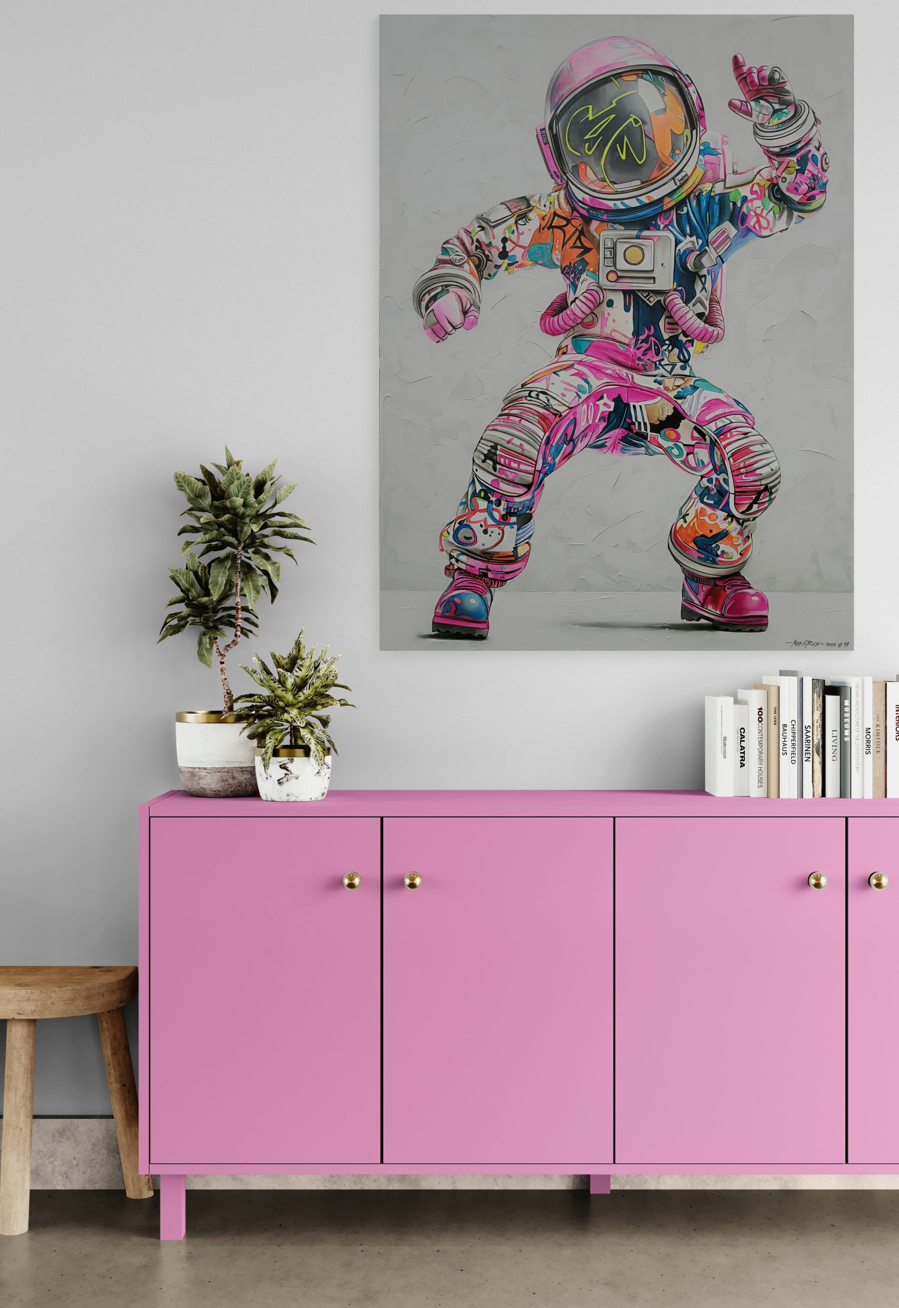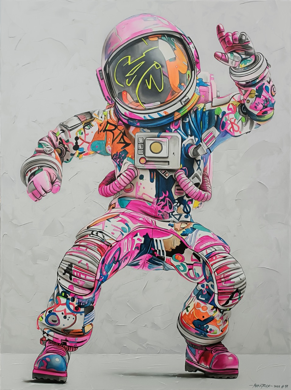 This time, the spotlight is on a female figure — bold, empowered, and intuitive. Her vibrant astronaut suit becomes a symbol of inner freedom, creative chaos, and fearless self-expression.