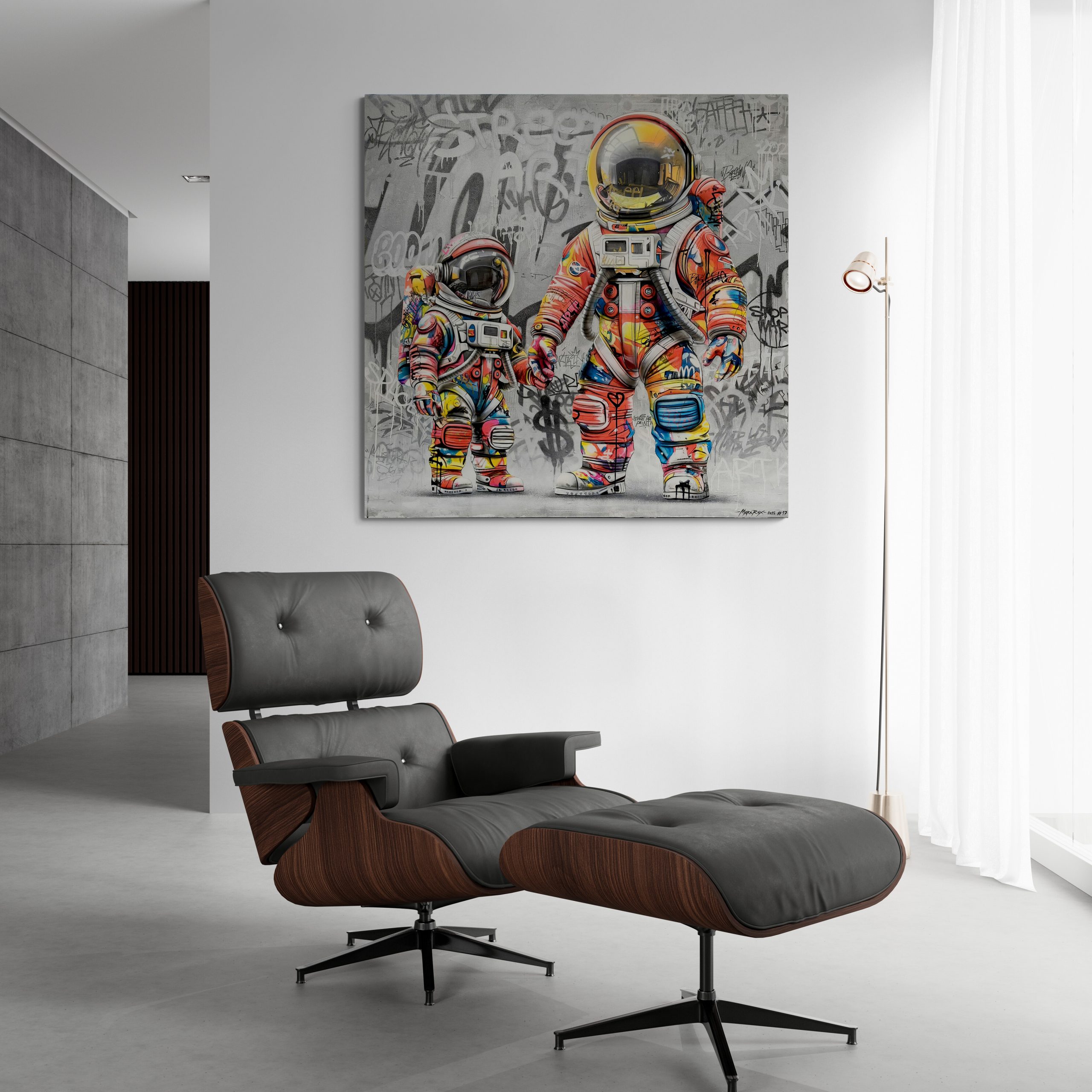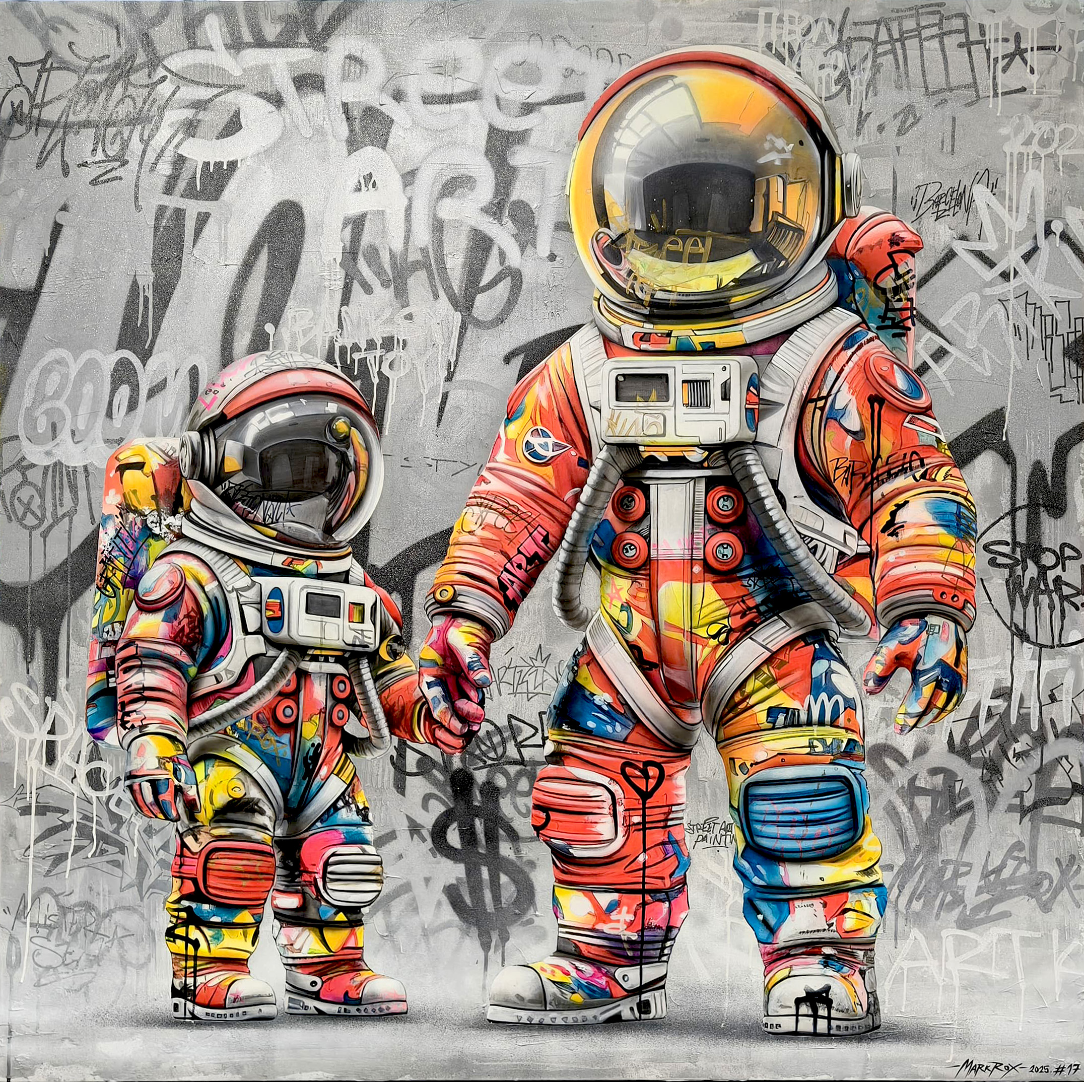 “Artonaut #17 is part of Mark Rox’s Artonaut series, integrating urban visual language with space-related iconography. The work is executed in UV acrylic and phosphor pigments, activating under variable lighting conditions. An augmented reality layer extends the composition beyond the physical surface. The painting addresses the conceptual premise that children do not fly into space, using space as a metaphor for aspirational constructs formed in childhood. The adult figure signifies responsibility and lived experience, while the child represents imagination and potential. Through light-reactive materials and AR activation, the work articulates the transformation of early aspirations over time.”