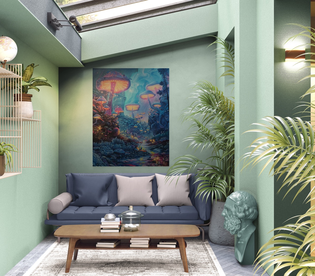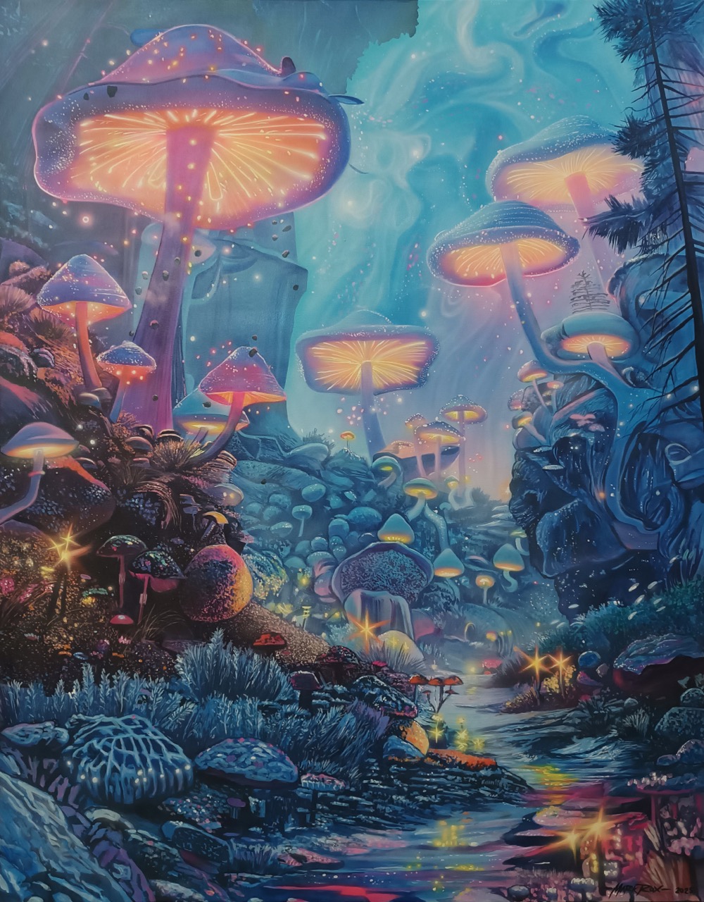 ”Mushroom Forest” new acrylic painting by Mark Rox exploring the intersection of fantasy and immersive technology. Executed in a rich neon palette, the composition depicts a dense, bioluminescent mushroom landscape illuminated by ultraviolet light sources. Layered brushwork and controlled gradients create a sense of atmospheric depth, while reflective elements guide the viewer’s eye through a winding stream toward a luminous horizon. Integrated AR features allow digital inhabitants of the forest to appear when viewed through compatible devices, extending the work beyond the physical surface. This piece represents a new experimental direction in my practice.