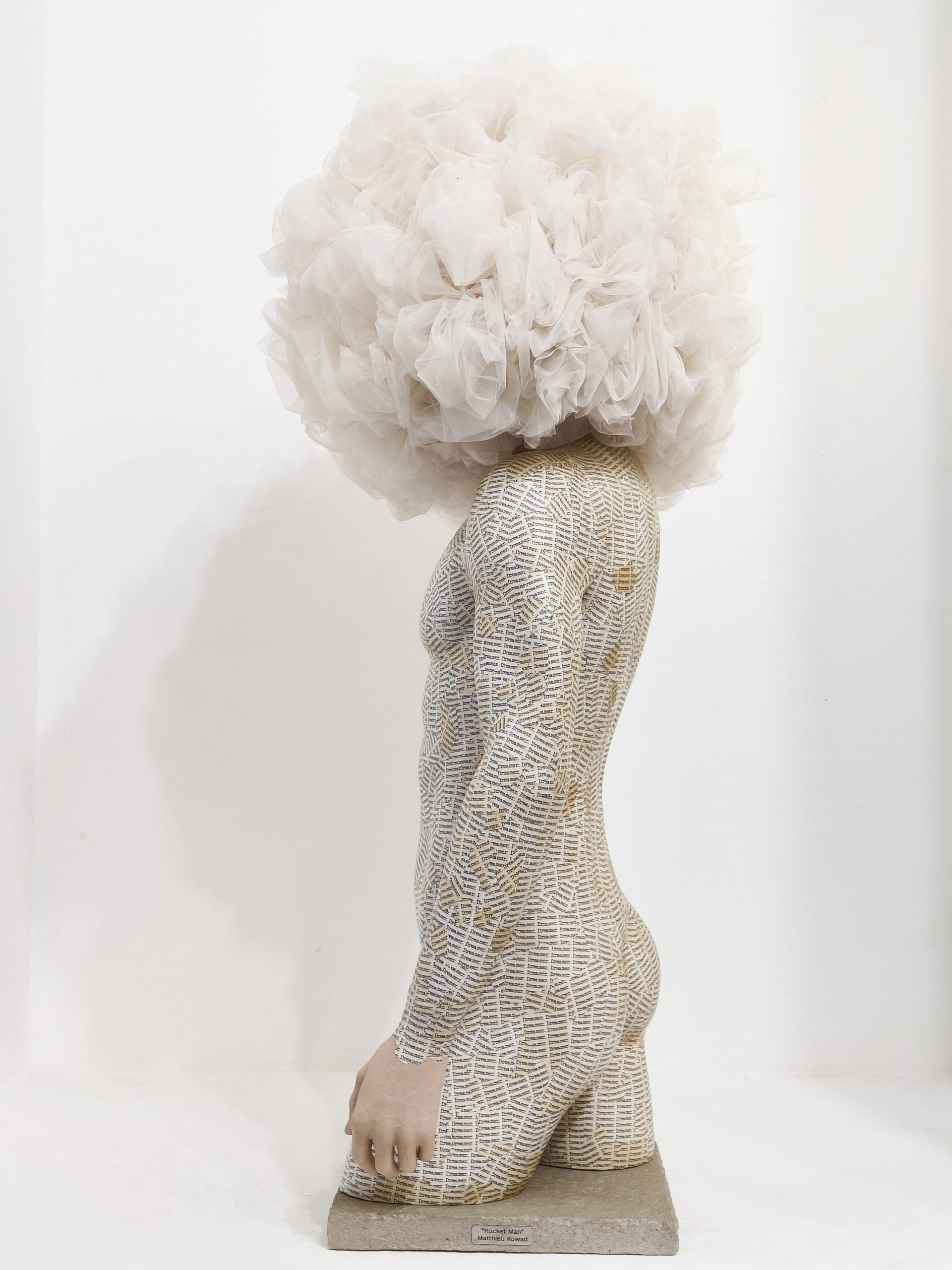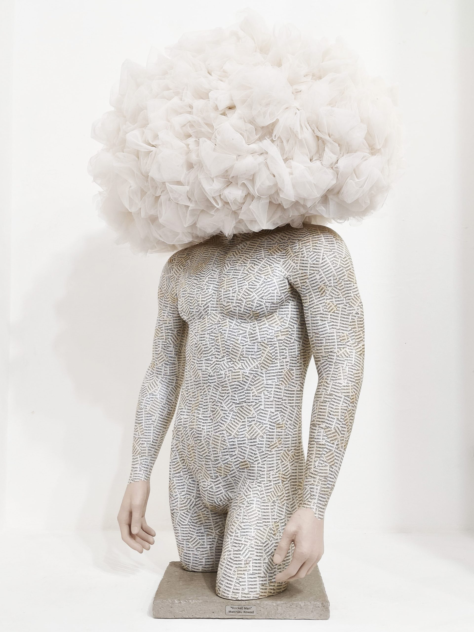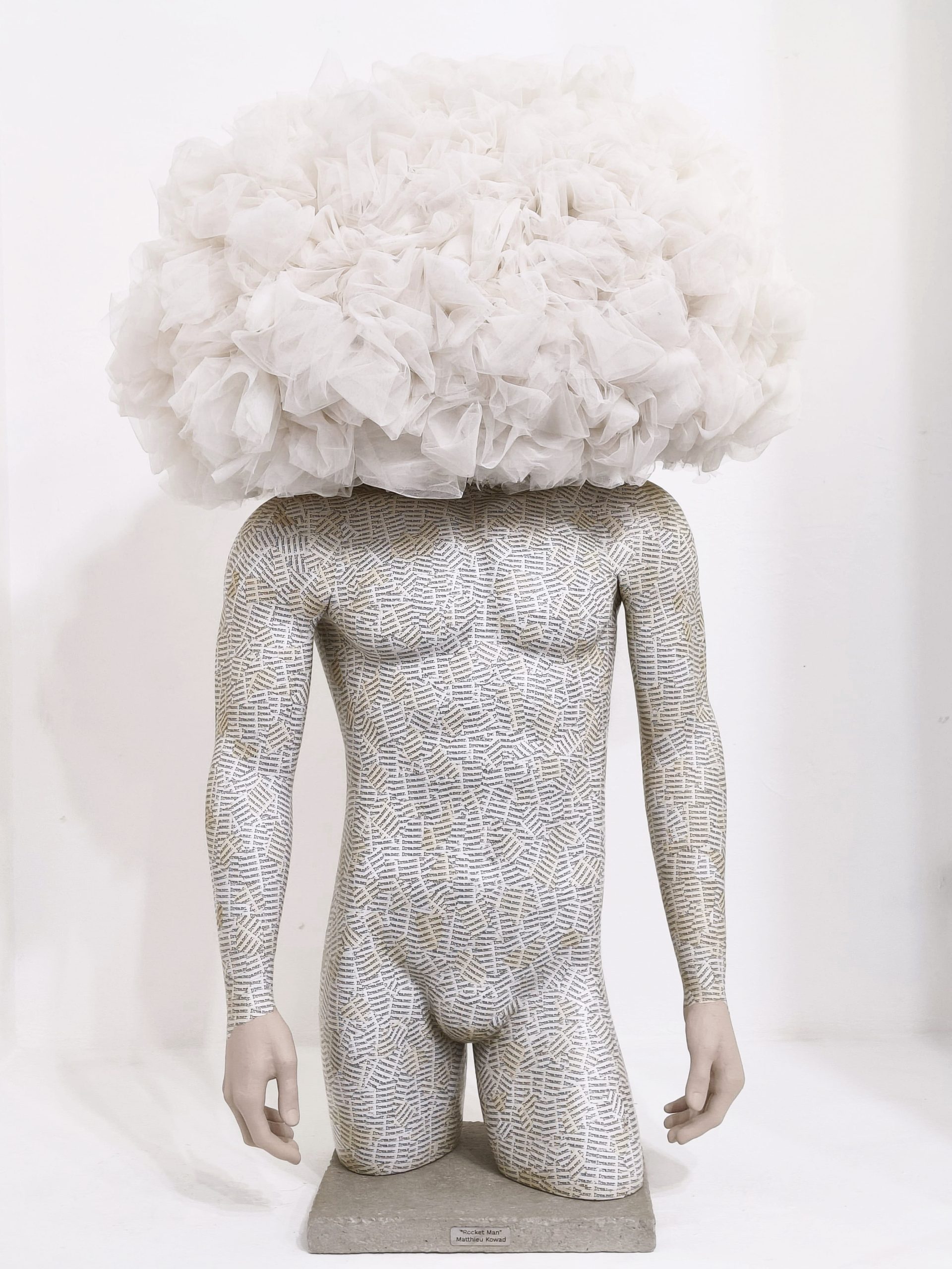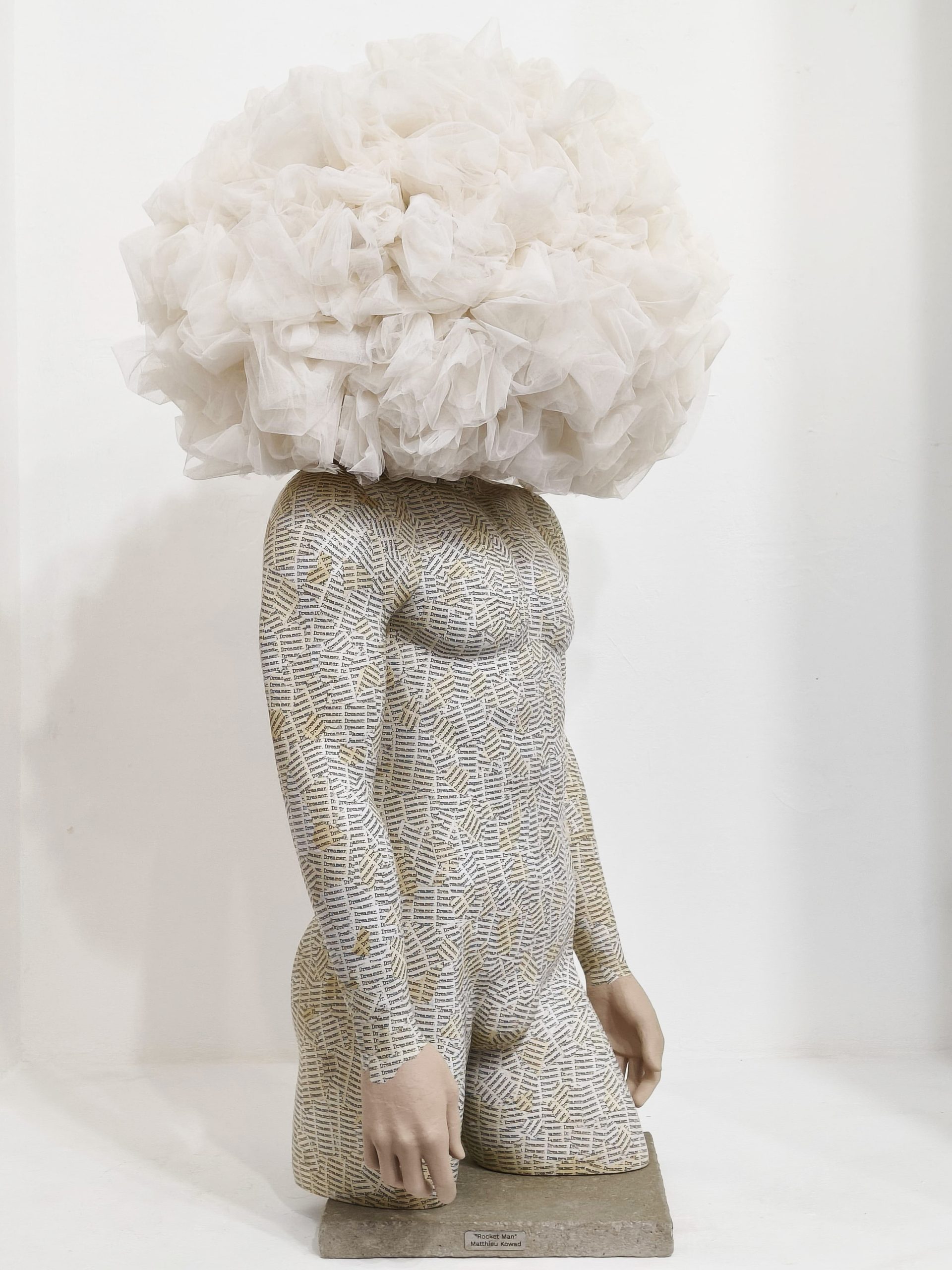 Mannequin, wire, tulle, tea-infused paper, and concrete